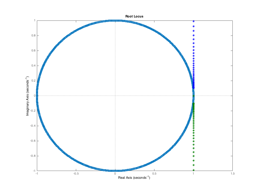 Note that for every value of proportional gain, the magnitudes of the natural frequencies are always greater than one and the system is always unstable. Note that in the figure, we show the circle of complex numbers with magnitude one, so one can see that the natural frequencies are outside the unit circle.