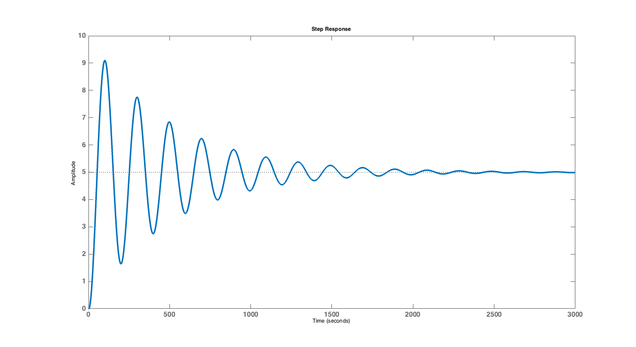 The natural frequencies are the eigenvalues of the 3 \times 3 matrix above, and are not easy to find. If we are careful, we could use the determinant formula to derive a third-order (cubic) polynomial whose roots are the eigenvalues, but then we would also have to figure out the complicated analytic formula for roots of cubics. Instead, we suggest using an eigenvalue calculator (for example, np.linalg.eigvals in python). As an example, if \Delta T = 0.01, K_p = 10 and K_d = 0.5, the natural frequencies are approximately 0.997 + 0.0316 j, 0.997 - 0.0316 j and 0.005, all less than one in magnitude, so the system is stable. And its step response (normalized) oscillates, but does stabilize.