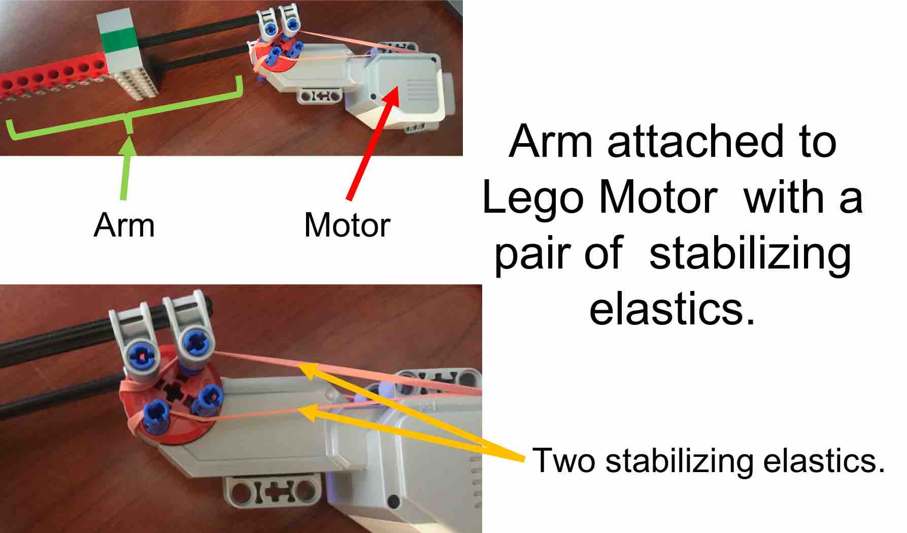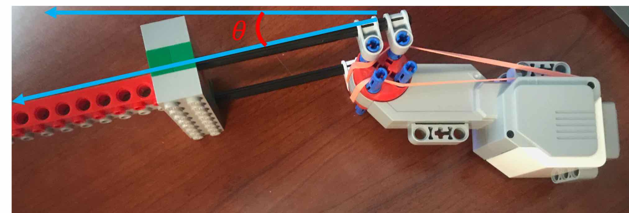 In earlier versions of 6.302, we rotated a heavier arm using a geared Lego motor, shown in the figure below. The figure also shows that we used two rubber bands to create an angle dependent torque on the motor (both to assist the motor when holding heavy loads, and to eliminate gear "backlash"). That angle dependent force will have a number of interesting consequences, ones that we hope will help you develop a better understanding of controller design.