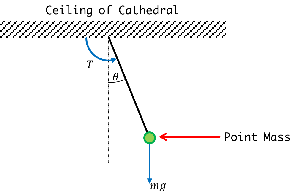 Imagine a pendulum suspended from a tree trunk, swaying thanks to occasional torque forces generated by gusts of wind. We can generate a state-space model for the pendulum by treating it as a point mass, accelerated by a vector sum of forces, as in the figure above.
