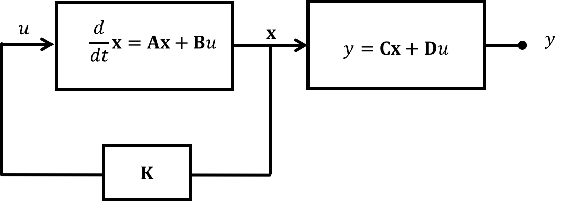 We actually gain the ability to move the poles around because where before we assumed the input to the system was nothing (u=0), we're now saying that the input is based on the state multiplied by some gain vector \textbf{K}. This means our new expression for the system poles is: