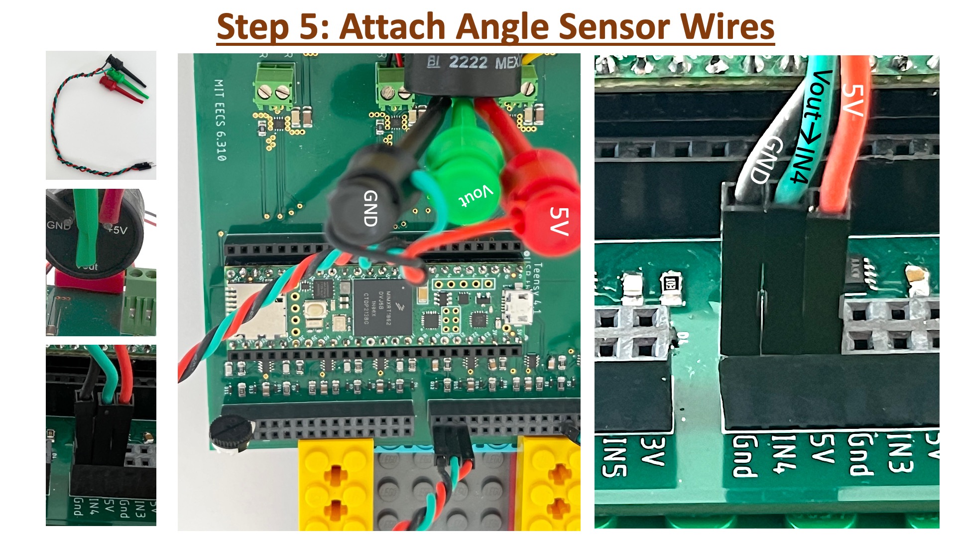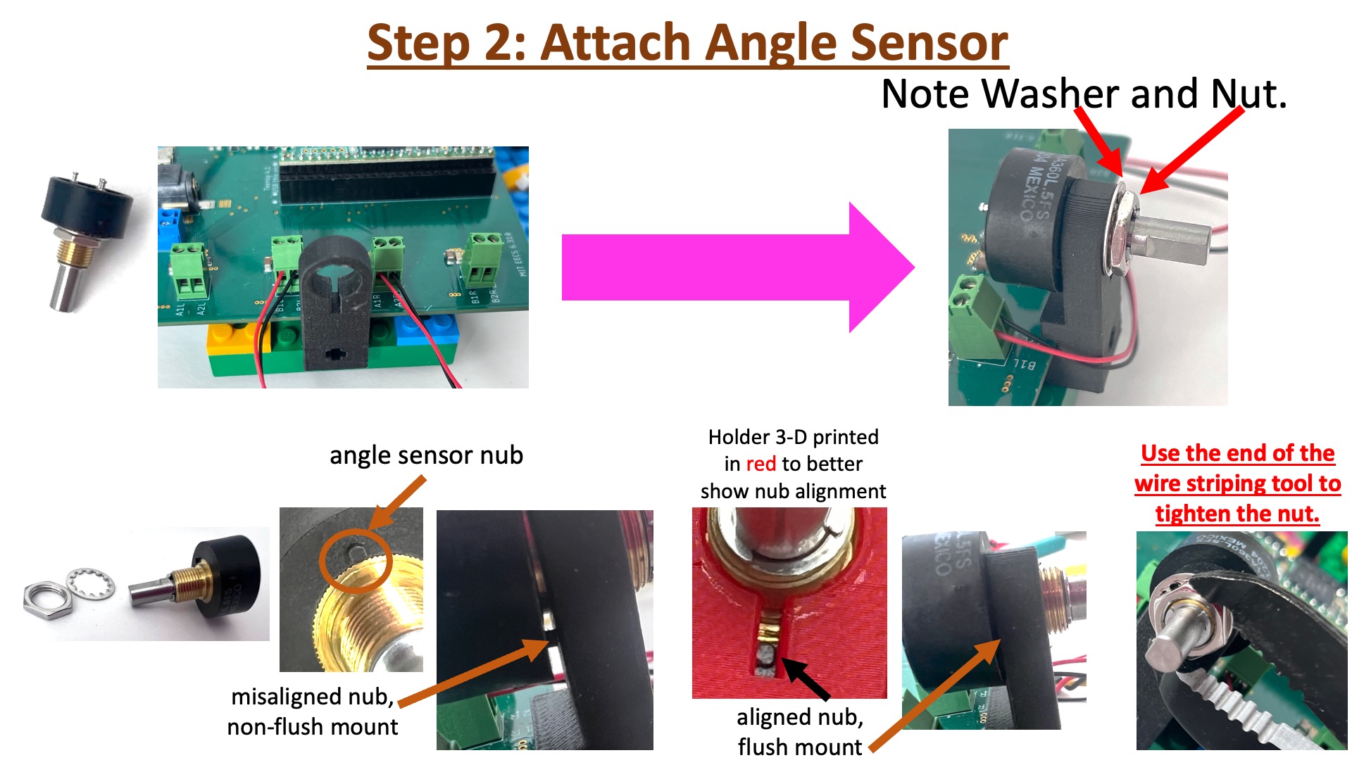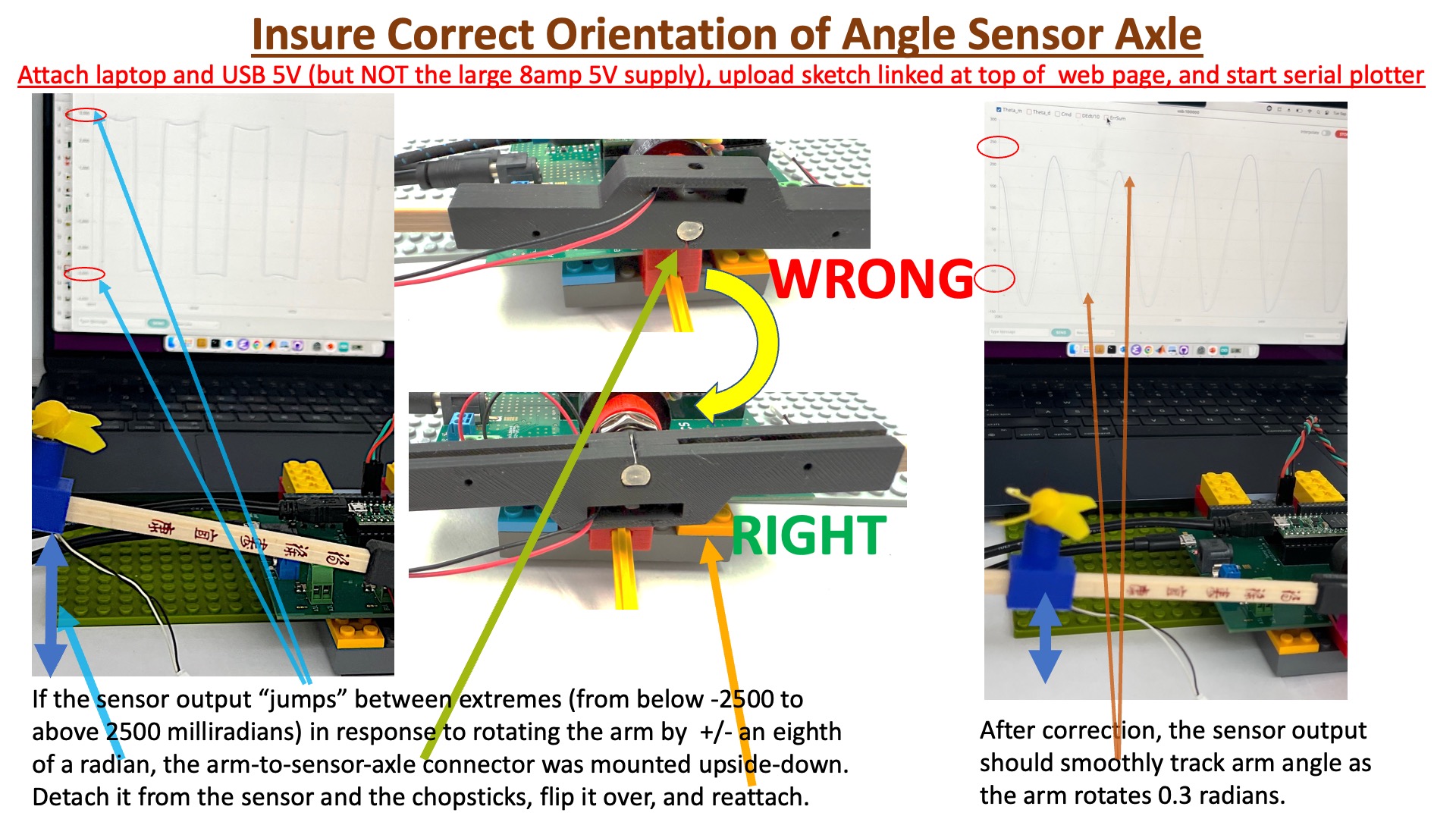 The angle sensor axle will correctly fit into the arm connector ONLY if the slit in the axle is aligned with the small outcropping in the connector. Unfortunately, there are two possible slit-connector alignments that fit correctly, and one mis-rotates the sensor axle by a half rotation. The procedure for fixing the sensor is detailed in the image below.