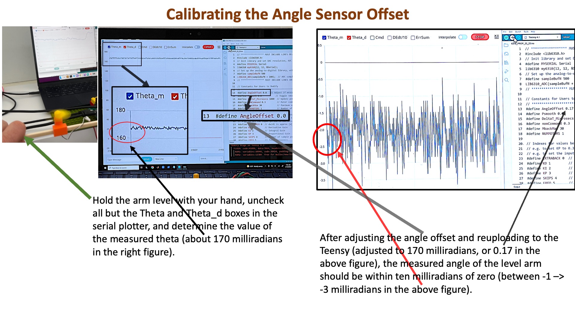 Place your propeller control system so that the arm hangs off the edge of a desk or table, and can rotate freely (though be sure you've attached the yellow over-rotation preventer). Make sure your laptop is connected to the Teensy 4.1, and the USB 5V supply is connected to the controller board. Then upload the sketch to the Teensy 4.1, start the serial plotter, unclick all the plot check boxes except for the theta and theta_d plots, AND use the send window to set the proportional feedback gain, K_p, to 0.3 (by typing 3 0.3 in the send window). Finally, while holding the propeller arm level with your hand, connect the 5V 8amp supply and then adjust the nominal command potentiometer until you feel the arm hold itself level.