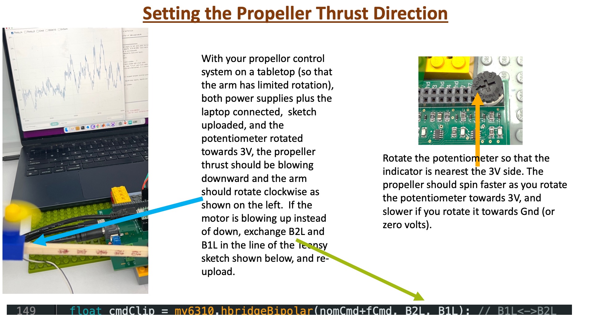 Place your propeller control system on a tabletop (so that the arm has limited rotation), make sure your laptop is connected to the Teensy 4.1, and the USB 5V supply connected to the controller board. Then upload the sketch to the Teensy 4.1 and ONLY THEN connect the 5V 8amp supply to the controller board. Adjust the motor command in the Teensy sketch, as show in the figure below, so that the arm rotates clockwise.