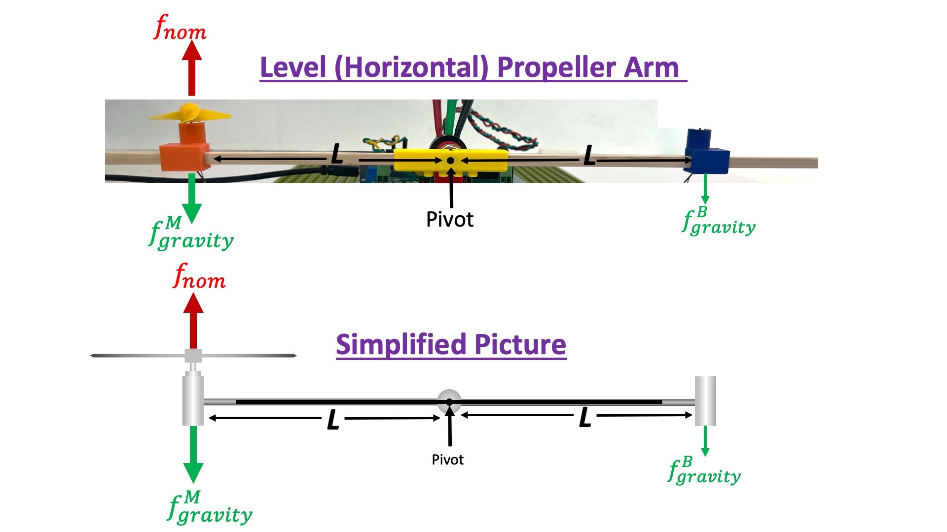 In the top half of the figure below, we show an image of propeller arm in the level (horizontal) position, and make note of the torque-producing gravity- and thrust-generated forces. In the bottom half of the figure, we note the same forces on a "cartoon" of the arm, a simplified picture that appears frequently in our lab descriptions because the cartoon makes the salient features more visible.