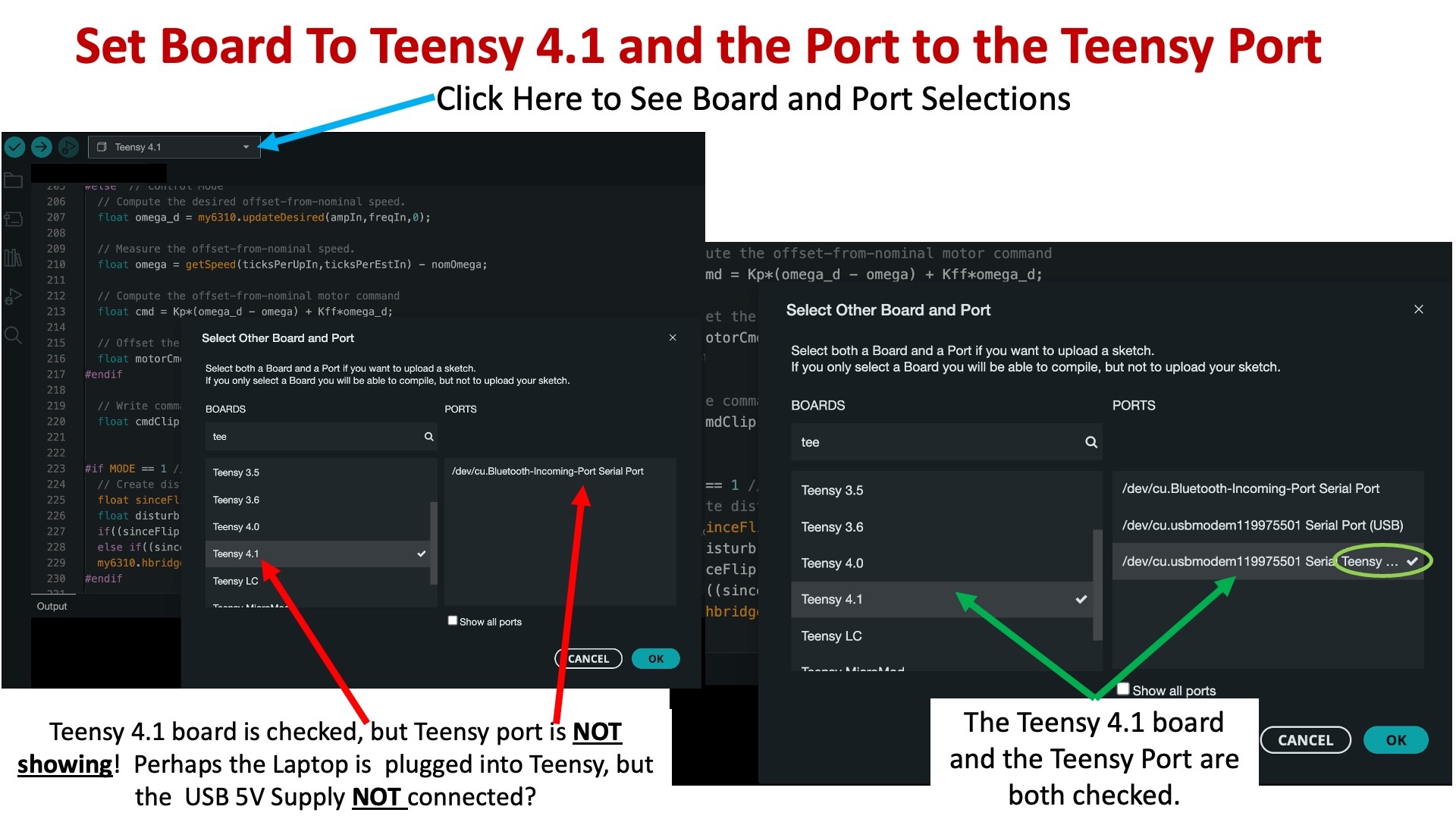 - Open the Arduino IDE 2.3.4 on your laptop, click the down arrow in the board selection box at the left side of the top banner of the IDE, and open up the board and port selection window. Search through the list of boards and select the Teensy 4.1, then search through the list of ports, and select the port that is labeled with "teensy". Finally, close and then reopen the board selection window and verify that the selected board is the Teensy 4.1, and that the selected port has a "teensy" label(see the figure below).