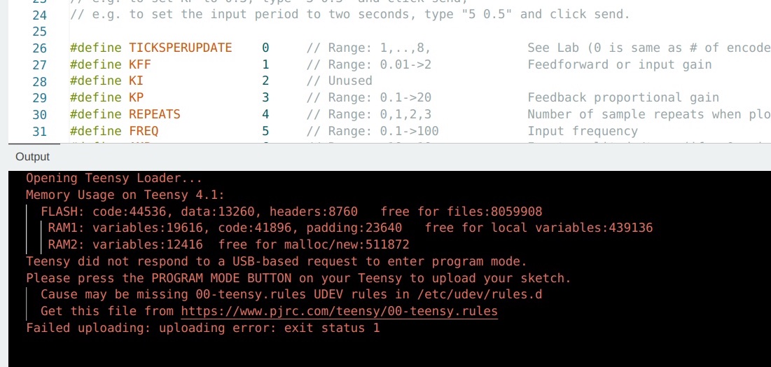 - If the upload fails, try pressing the small white button on the Teensy 4.1. Or try unplugging and then replugging BOTH the laptop and USB 5V supply connections to the Teensy. Or just try again. Or try quitting out of the Arduino IDE and restarting it. Or try restarting your computer. Or ask for help.